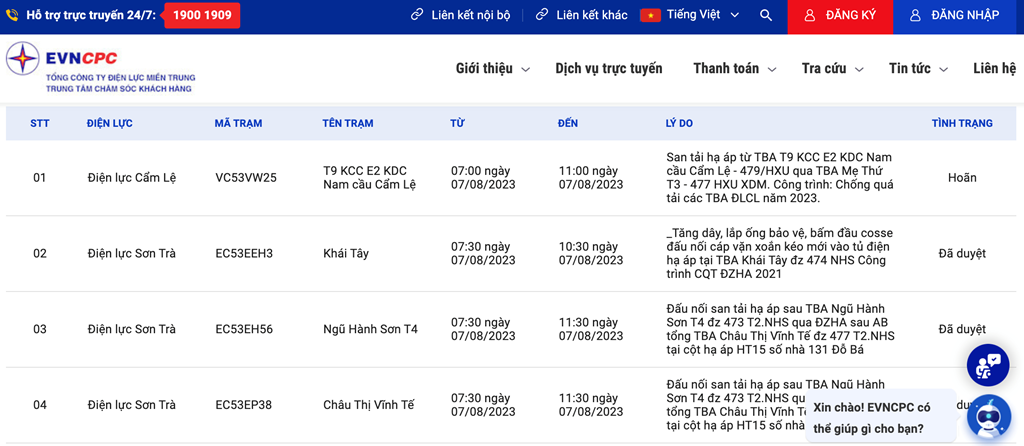 | 1 | Điện lực Cẩm Lệ | VC53VW25 | T9 KCC E2 KDC Nam cầu Cẩm Lệ | 07:00 07/08/2023 | 11:00 07/08/2023 | San tải hạ áp từ TBA T9 KCC E2 KDC Nam cầu Cẩm Lệ - 479/HXU qua TBA Mẹ Thứ T3 - 477 HXU XDM.Công trình: Chống quá tải các TBA ĐLCL năm 2023. | Hoãn |