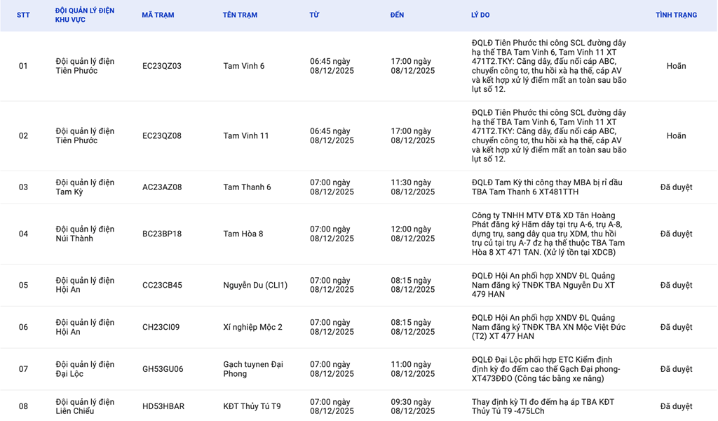 | 2 | Đội quản lý điện Tiên Phước | EC23QZ08 | Tam Vinh 11 | 06:45 08/12/2025 | 17:00 08/12/2025 | ĐQLĐ Tiên Phước thi công SCL đường dây hạ thế TBA Tam Vinh 6, Tam Vinh 11 XT 471T2.TKY: Căng dây, đấu nối cáp ABC, chuyển công tơ, thu hồi xà hạ thế, cáp AV và kết hợp xử lý điểm mất an toàn sau bão lụt số 12. | Hoãn |