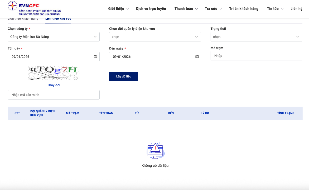 Lịch cắt điện tại Thành phố Đà Nẵng ngày mai 9/1/2026, cập nhật mới nhất vào ngày 8/1 từ website Tổng công ty Điện lực miền Trung. Ảnh: Bnews/vnanet.vn
