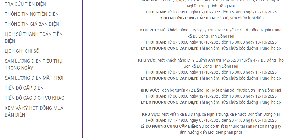 THỜI GIAN: Từ 07:30:00 ngày 11/10/2025 đến 16:30:00 ngày 11/10/2025LÝ DO NGỪNG CUNG CẤP ĐIỆN: Thí nghiệm, sửa chữa bảo dưỡng Trung, hạ ápKHU VỰC: Một phần xã Phú Riềng, một phần xã Phú Trung, tỉnh Đồng Nai.