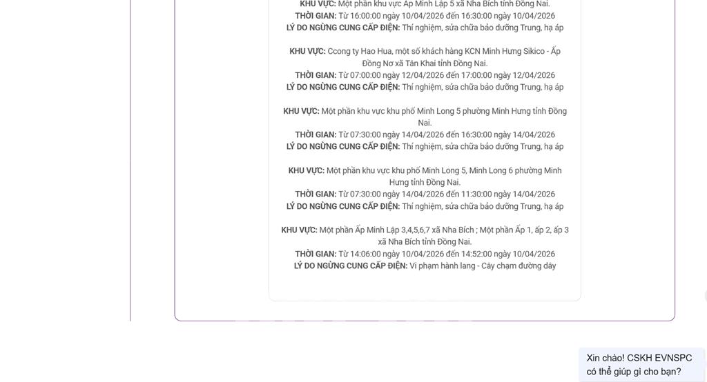 Lịch ngừng cấp điện tại Đồng Nai ngày mai 12/4 được cập nhật ngày 11/4 tại website của EVNSPC. Ảnh: BNEWS phát