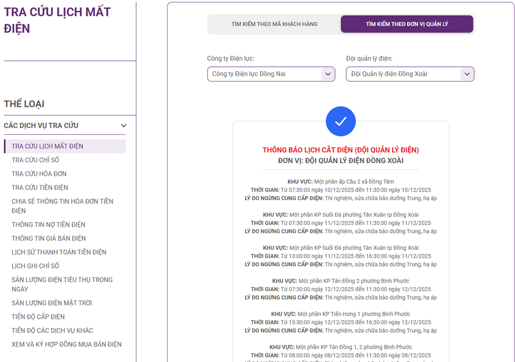 Cập nhật mới nhất lịch cắt điện cụ thể tại Đồng Nai từ website của Tổng công ty Điện lực miền Nam (EVNSPC), Công ty TNHH MTV Điện lực Đồng Nai vào ngày mai 13/12.