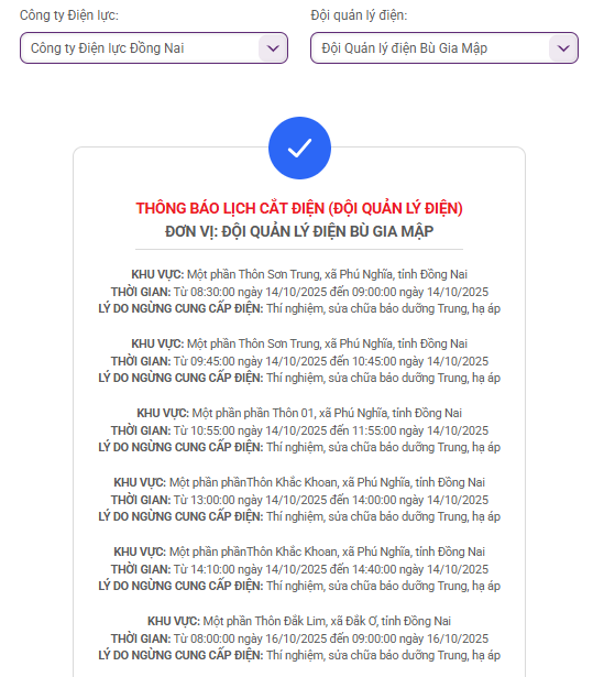 Cập nhật mới nhất lịch cắt điện cụ thể tại Đồng Nai từ website của Tổng công ty Điện lực miền Nam (EVNSPC), Công ty TNHH MTV Điện lực Đồng Nai vào ngày mai 14/10.