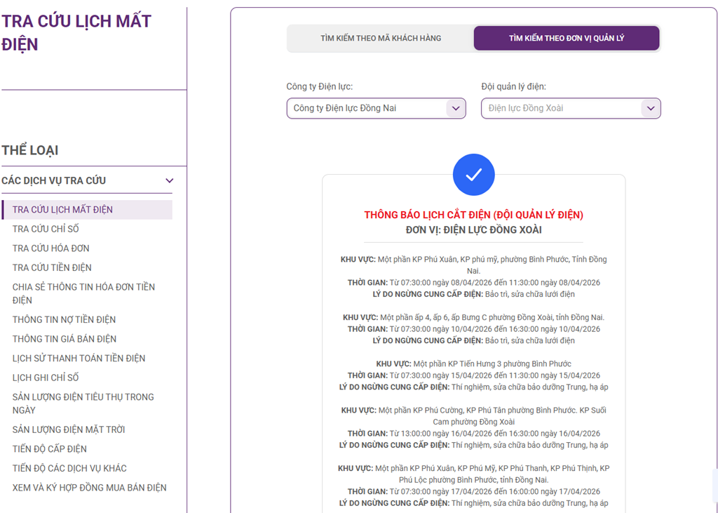 Cập nhật mới nhất hiện không có lịch cắt điện tại các xã, phường ở Đồng Nai từ website của Tổng công ty Điện lực miền Nam (EVNSPC), Công ty TNHH MTV Điện lực Đồng Nai vào ngày mai 14/4.