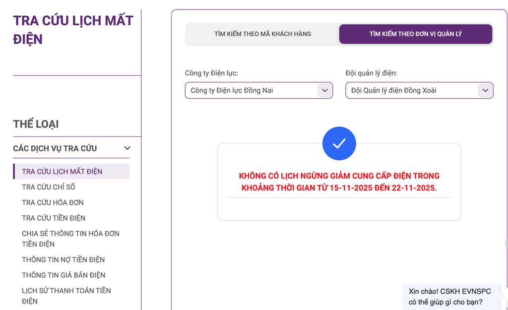 Cập nhật mới nhất lịch cắt điện cụ thể tại Đồng Nai từ website của Tổng công ty Điện lực miền Nam (EVNSPC), Công ty TNHH MTV Điện lực Đồng Nai vào ngày mai 16/11.