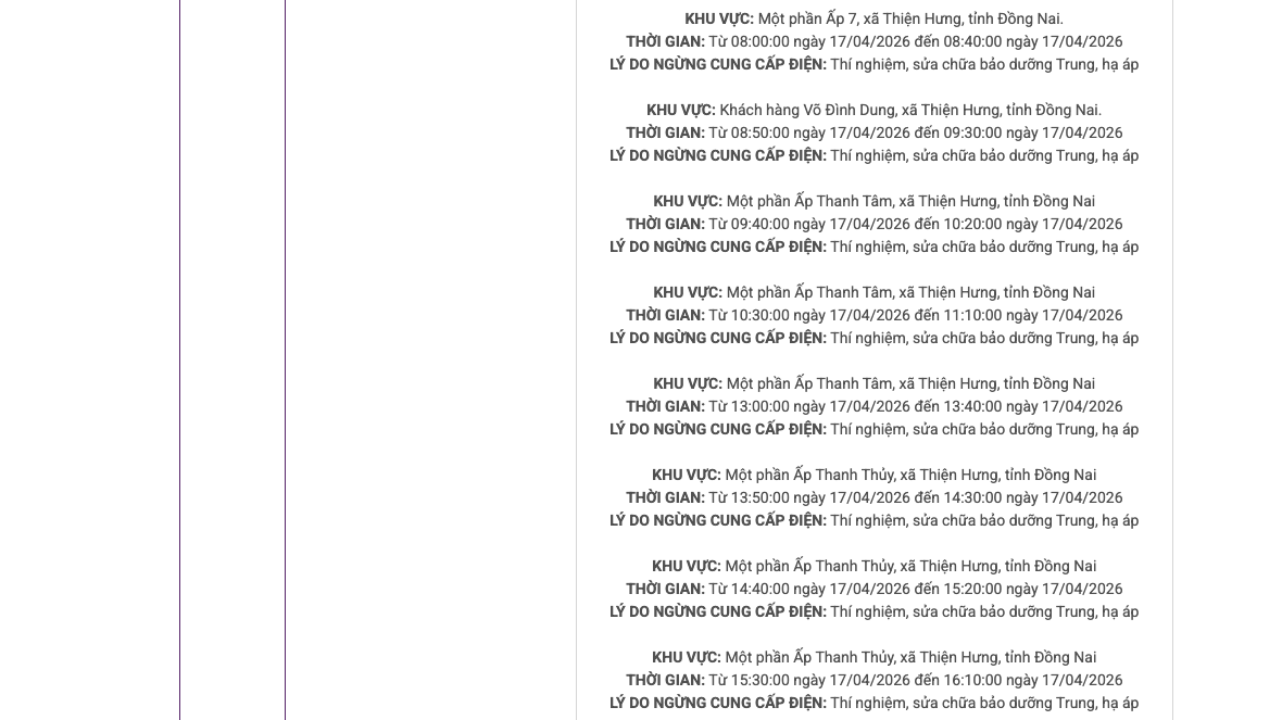 LÝ DO NGỪNG CUNG CẤP ĐIỆN: Thí nghiệm, sửa chữa bảo dưỡng Trung, hạ ápKHU VỰC: Một phần Thôn 9, xã Nghĩa Trung, tỉnh Đồng Nai.