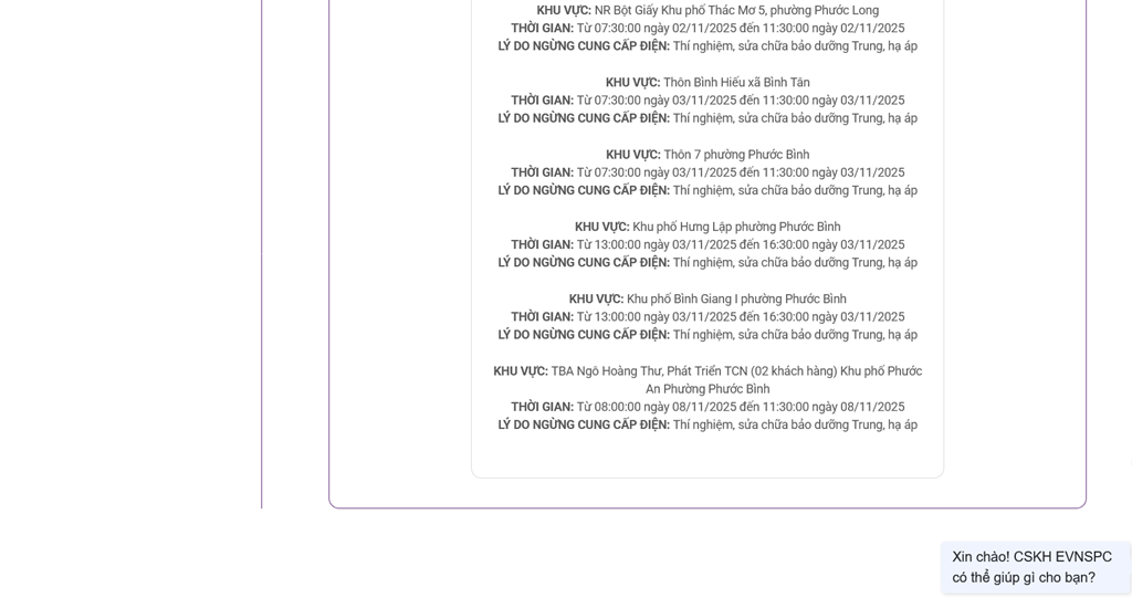 THỜI GIAN: Từ 07:30:00 ngày 02/11/2025 đến 11:30:00 ngày 02/11/2025LÝ DO NGỪNG CUNG CẤP ĐIỆN: Thí nghiệm, sửa chữa bảo dưỡng Trung, hạ áp KHU VỰC: 1 kh Phan Thị Huyền Trang xã Thọ Sơn, Tỉnh Đồng Nai.THỜI GIAN: Từ 07:30:00 ngày 02/11/2025 đến 11:30:00 ngày 02/11/2025LÝ DO NGỪNG CUNG CẤP ĐIỆN: Thí nghiệm, sửa chữa bảo dưỡng Trung, hạ ápKHU VỰC: 1 phần xã Thọ Sơn, Tỉnh Đồng Nai.THỜI GIAN: Từ 07:30:00 ngày 02/11/2025 đến 10:00:00 ngày 02/11/2025LÝ DO NGỪNG CUNG CẤP ĐIỆN: Thí nghiệm, sửa chữa bảo dưỡng Trung, hạ áp KHU VỰC: Công ty TNHH Long Fa (2) trụ 196C/12C/27B//01 tuyến 474 Bình Long - Tân Khai trạm 110kV Bình Long- KP 3B phường Minh Hưng tỉnh Đồng Nai.THỜI GIAN: Từ 07:30:00 ngày 02/11/2025 đến 17:00:00 ngày 02/11/2025LÝ DO NGỪNG CUNG CẤP ĐIỆN: Thí nghiệm, sửa chữa bảo dưỡng Trung, hạ ápKHU VỰC: Công ty TNHH Long Fa (2) trụ 196C/12C/27A//01 tuyến 474 Bình Long trạm 110kV Bình Long - Tân Khai KP 3B phường Minh Hưng tỉnh Đồng Nai.THỜI GIAN: Từ 07:30:00 ngày 02/11/2025 đến 17:00:00 ngày 02/11/2025LÝ DO NGỪNG CUNG CẤP ĐIỆN: Thí nghiệm, sửa chữa bảo dưỡng Trung, hạ ápKHU VỰC: Công ty KHÁNH VÂN (Bìa carton) (CS: III-630 KVA) Trụ 92B/60/49/1 nhánh rẽ KHÁNH VÂN (Bìa carton) tuyến 476 Chơn Thành - Thành Tâm KP Trung Lợi phường Chơn Thành tỉnh Đồng Nai.THỜI GIAN: Từ 13:30:00 ngày 02/11/2025 đến 16:00:00 ngày 02/11/2025LÝ DO NGỪNG CUNG CẤP ĐIỆN: Thí nghiệm, sửa chữa bảo dưỡng Trung, hạ áp10 CÁCH TIẾT KIỆM ĐIỆN CHO GIA ĐÌNH