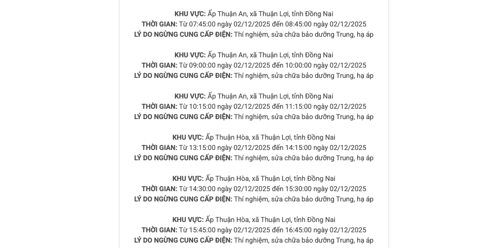 KHU VỰC: Ấp Thuận Hòa, xã Thuận Lợi, tỉnh Đồng Nai THỜI GIAN: Từ 13:15:00 ngày 02/12/2025 đến 14:15:00 ngày 02/12/2025 LÝ DO NGỪNG CUNG CẤP ĐIỆN: Thí nghiệm, sửa chữa bảo dưỡng Trung, hạ áp