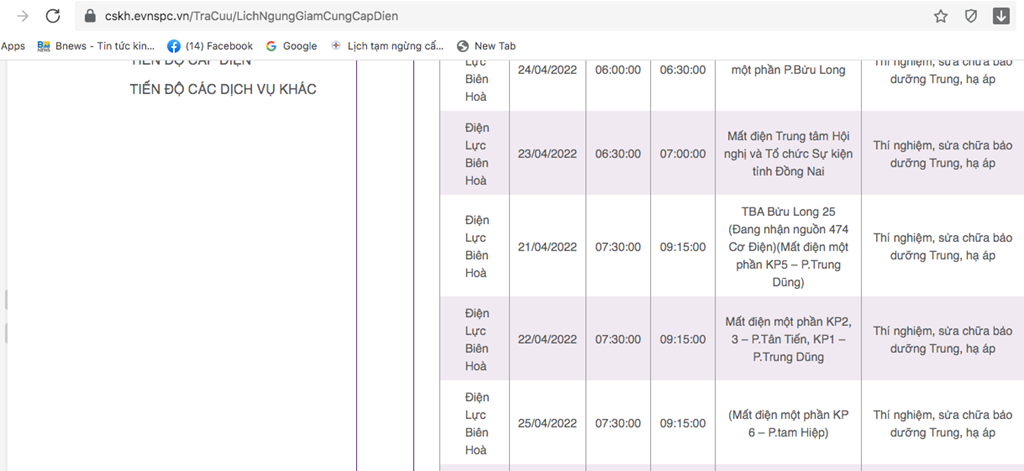 | Điện Lực Biên Hoà | 21/04/2022 | 13:30:00 | 15:15:00 | Mất điện một phần KP6 – P.Trung Dũng | Thí nghiệm, sửa chữa bảo dưỡng Trung, hạ áp |
