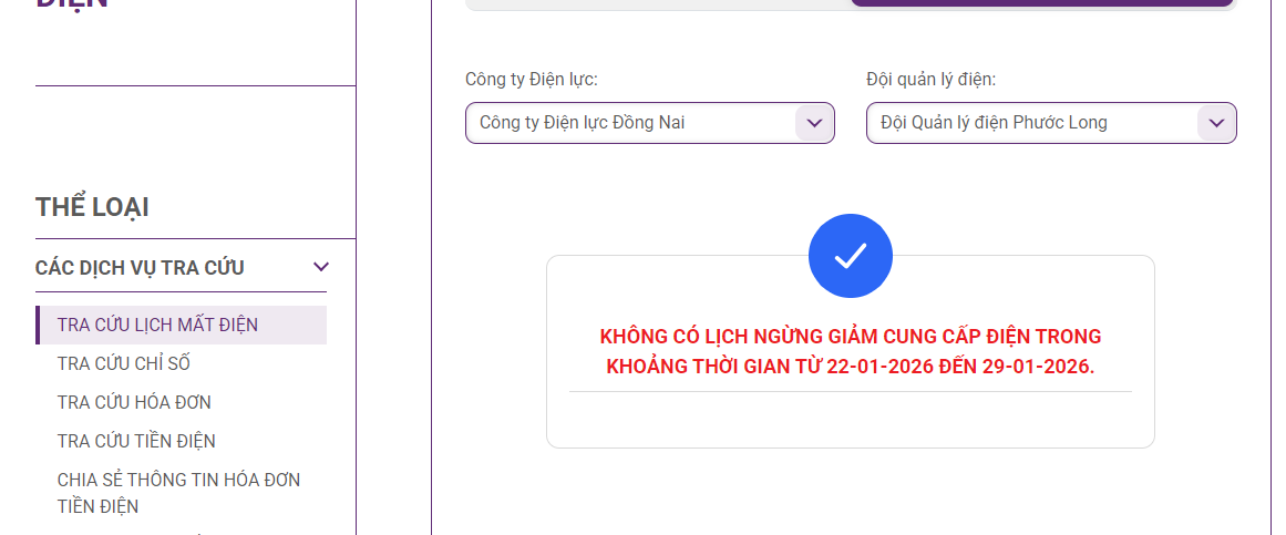 Cập nhật mới nhất lịch cắt điện cụ thể tại Đồng Nai từ website của Tổng công ty Điện lực miền Nam (EVNSPC), Công ty TNHH MTV Điện lực Đồng Nai vào ngày mai 23/1.