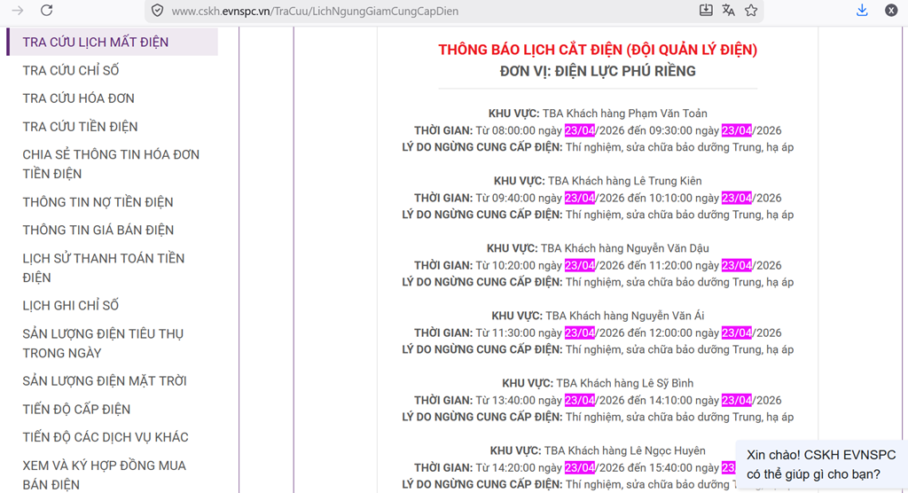 Chi tiết lịch cắt điện Đồng Nai ngày mai 23/4 cụ thể như sau: