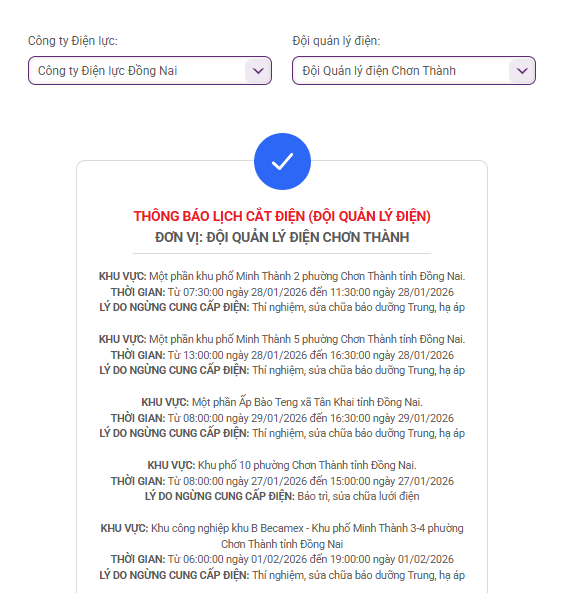 Cập nhật mới nhất từ website của Tổng công ty Điện lực miền Nam (EVNSPC), Công ty TNHH MTV Điện lực Đồng Nai, không có lịch cắt điện tại các xã, phường ở Đồng Nai vào ngày mai 26/1.