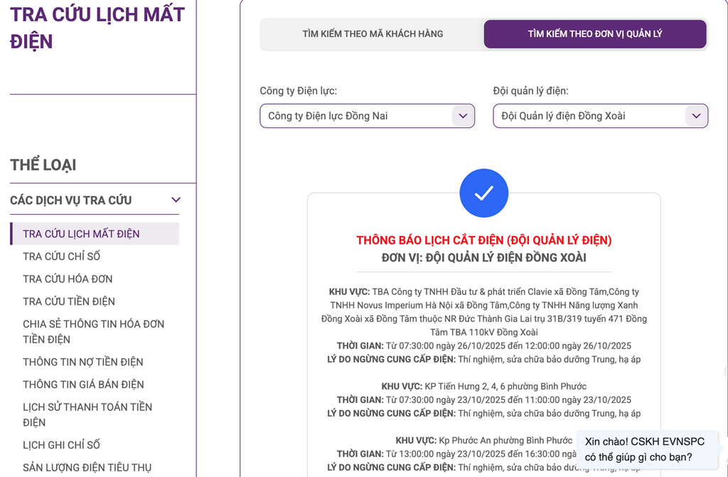 Cập nhật mới nhất lịch cắt điện cụ thể tại Đồng Nai từ website của Tổng công ty Điện lực miền Nam (EVNSPC), Công ty TNHH MTV Điện lực Đồng Nai vào ngày mai 26/10: