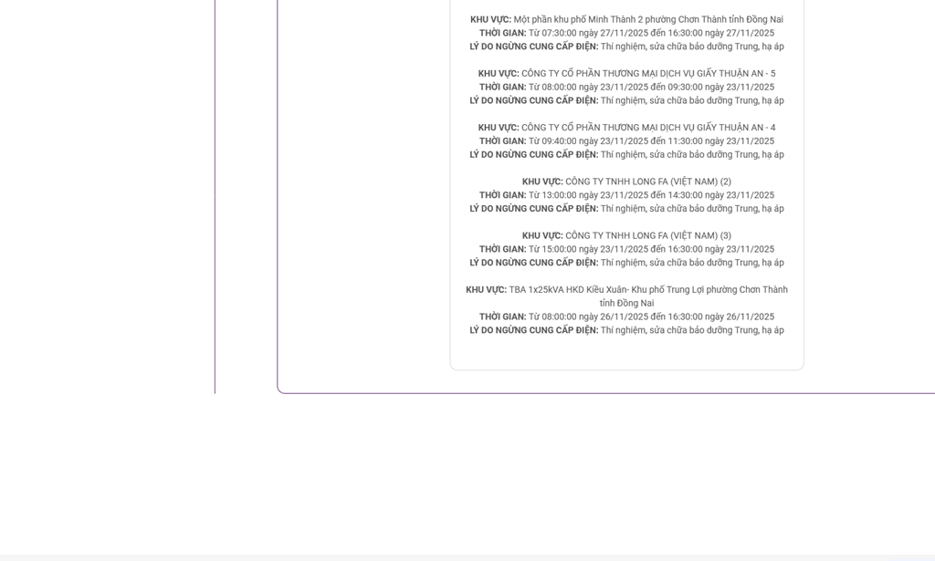 THỜI GIAN: Từ 07:30:00 ngày 27/11/2025 đến 16:30:00 ngày 27/11/2025LÝ DO NGỪNG CUNG CẤP ĐIỆN: Thí nghiệm, sửa chữa bảo dưỡng Trung, hạ áp KHU VỰC: Một phần ấp 1 xã Thiện Hưng, tỉnh Đồng Nai.THỜI GIAN: Từ 08:15:00 ngày 27/11/2025 đến 09:15:00 ngày 27/11/2025LÝ DO NGỪNG CUNG CẤP ĐIỆN: Thí nghiệm, sửa chữa bảo dưỡng Trung, hạ ápKHU VỰC: Một phần ấp Thanh Bình xã Thiện Hưng, tỉnh Đồng Nai.THỜI GIAN: Từ 09:20:00 ngày 27/11/2025 đến 10:20:00 ngày 27/11/2025LÝ DO NGỪNG CUNG CẤP ĐIỆN: Thí nghiệm, sửa chữa bảo dưỡng Trung, hạ ápKHU VỰC: Một phần ấp Thanh Xuân xã Thiện Hưng, tỉnh Đồng Nai.THỜI GIAN: Từ 10:30:00 ngày 27/11/2025 đến 11:30:00 ngày 27/11/2025LÝ DO NGỪNG CUNG CẤP ĐIỆN: Thí nghiệm, sửa chữa bảo dưỡng Trung, hạ ápKHU VỰC: Một phần ấp Thanh Bình xã Thiện Hưng, tỉnh Đồng Nai.THỜI GIAN: Từ 13:30:00 ngày 27/11/2025 đến 14:30:00 ngày 27/11/2025LÝ DO NGỪNG CUNG CẤP ĐIỆN: Thí nghiệm, sửa chữa bảo dưỡng Trung, hạ ápKHU VỰC: Một phần ấp 7 xã Thiện Hưng, tỉnh Đồng Nai.THỜI GIAN: Từ 14:40:00 ngày 27/11/2025 đến 15:40:00 ngày 27/11/2025LÝ DO NGỪNG CUNG CẤP ĐIỆN: Thí nghiệm, sửa chữa bảo dưỡng Trung, hạ áp10 CÁCH TIẾT KIỆM ĐIỆN CHO GIA ĐÌNH