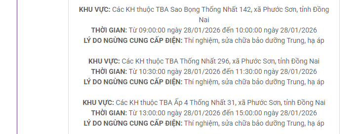 THỜI GIAN: Từ 09:00:00 ngày 28/01/2026 đến 10:00:00 ngày 28/01/2026LÝ DO NGỪNG CUNG CẤP ĐIỆN: Thí nghiệm, sửa chữa bảo dưỡng Trung, hạ ápKHU VỰC: Các KH thuộc TBA Thống Nhất 296, xã Phước Sơn, tỉnh Đồng Nai