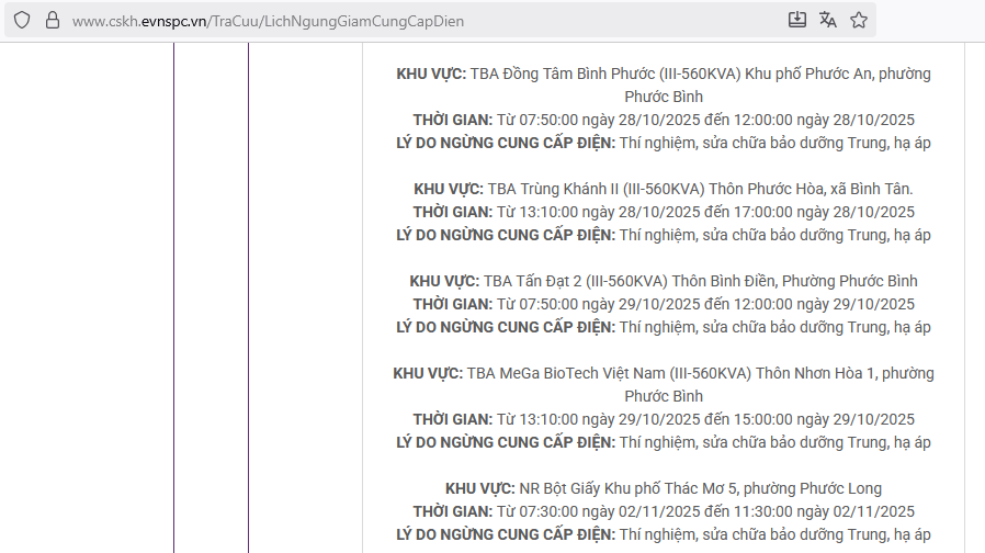 Thông tin về lịch cắt điện cập nhật mới nhất tại tỉnh Đồng Nai ngày mai 27/10 cập nhật mới nhất.
