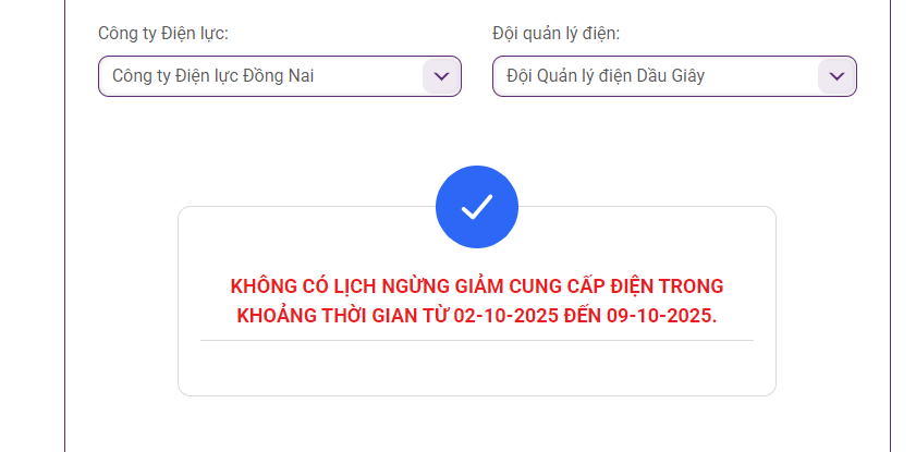 Lịch cắt điện cập nhật mới nhất tại các quận, huyện ở Đồng Nai từ website của Tổng công ty Điện lực miền Nam (EVNSPC), Công ty TNHH MTV Điện lực Đồng Nai không có kế hoạch cắt điện vào ngày mai 3/10.