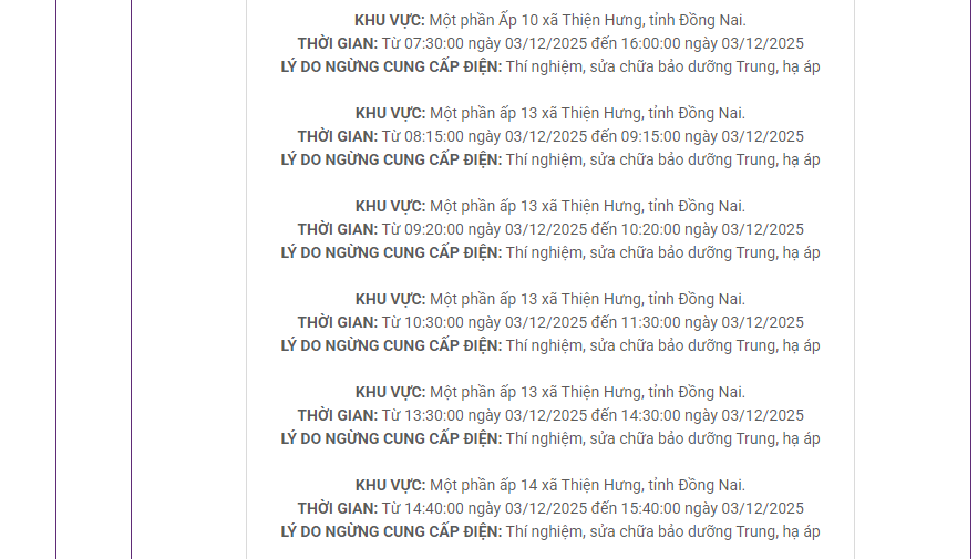 THỜI GIAN: Từ 08:15:00 ngày 03/12/2025 đến 09:15:00 ngày 03/12/2025LÝ DO NGỪNG CUNG CẤP ĐIỆN: Thí nghiệm, sửa chữa bảo dưỡng Trung, hạ ápKHU VỰC: Một phần ấp 13 xã Thiện Hưng, tỉnh Đồng Nai.