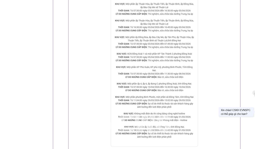 Cập nhật mới nhất lịch cắt điện cụ thể tại Đồng Nai từ website của Tổng công ty Điện lực miền Nam (EVNSPC), Công ty TNHH MTV Điện lực Đồng Nai vào ngày mai 3/4.