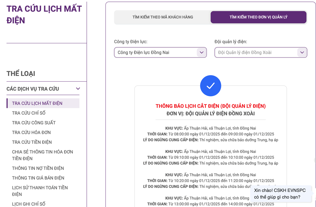 Cập nhật mới nhất lịch cắt điện cụ thể tại Đồng Nai từ website của Tổng công ty Điện lực miền Nam (EVNSPC), Công ty TNHH MTV Điện lực Đồng Nai vào ngày mai 30/11.