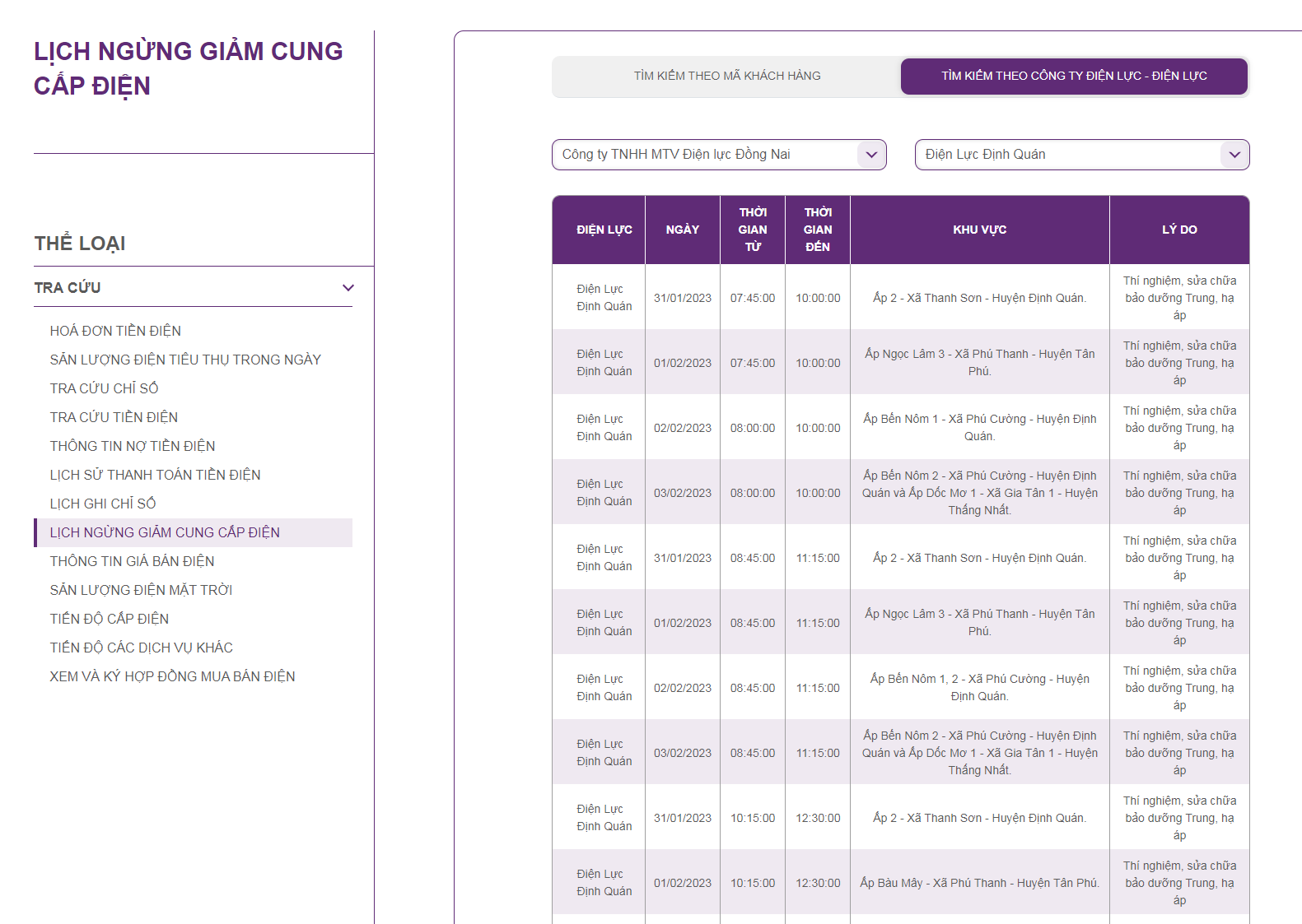 | Điện Lực Định Quán | 31/01/2023 | 7:45:00 | 10:00:00 | Ấp 2 - Xã Thanh Sơn - Huyện Định Quán. | Thí nghiệm, sửa chữa bảo dưỡng Trung, hạ áp |