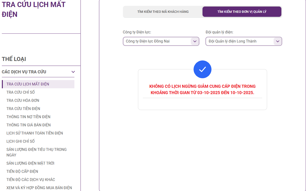 Lịch cắt điện cập nhật mới nhất tại các quận, huyện ở Đồng Nai từ website của Tổng công ty Điện lực miền Nam (EVNSPC), Công ty TNHH MTV Điện lực Đồng Nai không có kế hoạch cắt điện vào ngày mai 4/10.