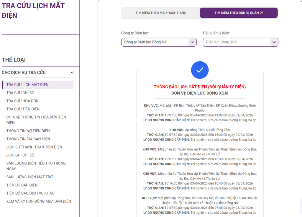 Cập nhật mới nhất lịch cắt điện cụ thể tại Đồng Nai từ website của Tổng công ty Điện lực miền Nam (EVNSPC), Công ty TNHH MTV Điện lực Đồng Nai vào ngày mai 4/4.