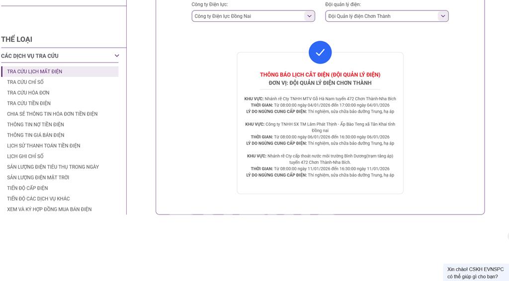 Cập nhật mới nhất lịch cắt điện cụ thể tại Đồng Nai từ website của Tổng công ty Điện lực miền Nam (EVNSPC), Công ty TNHH MTV Điện lực Đồng Nai vào ngày mai 6/1.