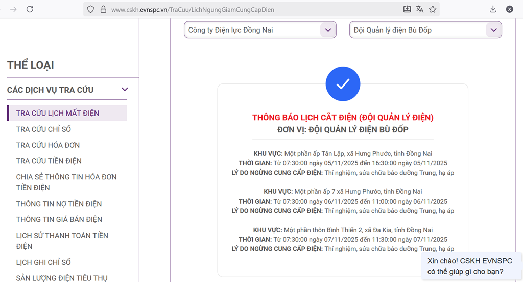 Chi tiết lịch cắt điện Đồng Nai ngày mai 6/11 cụ thể như sau: