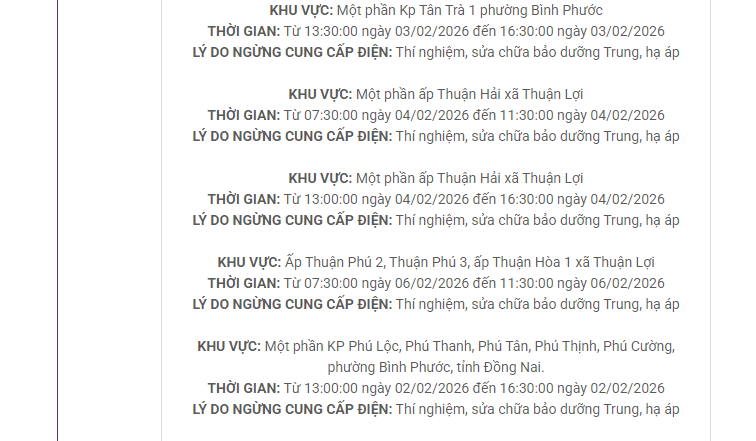 Cập nhật mới nhất lịch cắt điện cụ thể tại các xã, phường ở Đồng Nai ngày mai 6/2/2026 từ website của Tổng công ty Điện lực miền Nam (EVNSPC) cụ thể như sau: