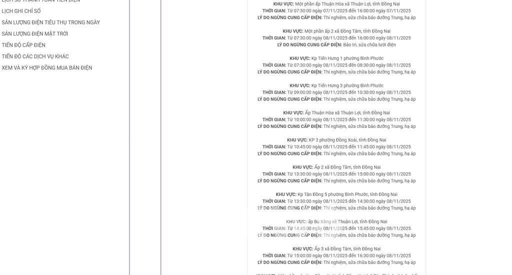 Cập nhật mới nhất lịch cắt điện cụ thể tại Đồng Nai từ website của Tổng công ty Điện lực miền Nam (EVNSPC), Công ty TNHH MTV Điện lực Đồng Nai vào ngày mai 7/11.