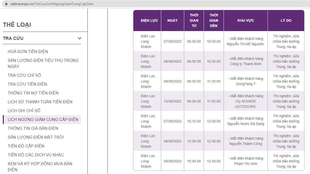 | Điện Lực Thống Nhất | 11/8/2023 | 07:45:00 | 09:15:00 | Ấp 94 - xã Hưng Lộc | Thí nghiệm, sửa chữa bảo dưỡng Trung, hạ áp |