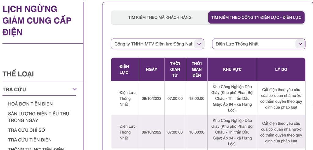 | Điện Lực Thống Nhất | 09/10/2022 | 07:00:00 | 18:00:00 | Khu Công Nghiệp Dầu Giây (Khu phố Phan Bội Châu - Thị trấn Dầu Giây; Ấp 94 - xã Hưng Lộc). | Cắt điện theo yêu cầu của cơ quan nhà nước có thẩm quyền theo quy định của pháp luật |