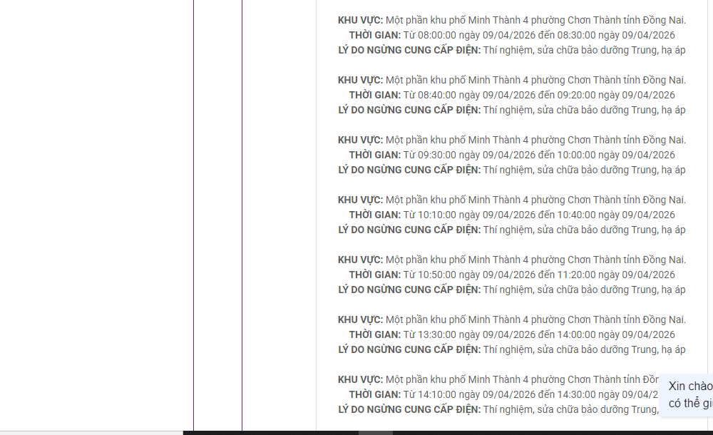 THỜI GIAN: Từ 15:20:00 ngày 09/04/2026 đến 15:50:00 ngày 09/04/2026LÝ DO NGỪNG CUNG CẤP ĐIỆN: Thí nghiệm, sửa chữa bảo dưỡng Trung, hạ ápKHU VỰC: Một phần khu phố Minh Thành 4 phường Chơn Thành tỉnh Đồng Nai.