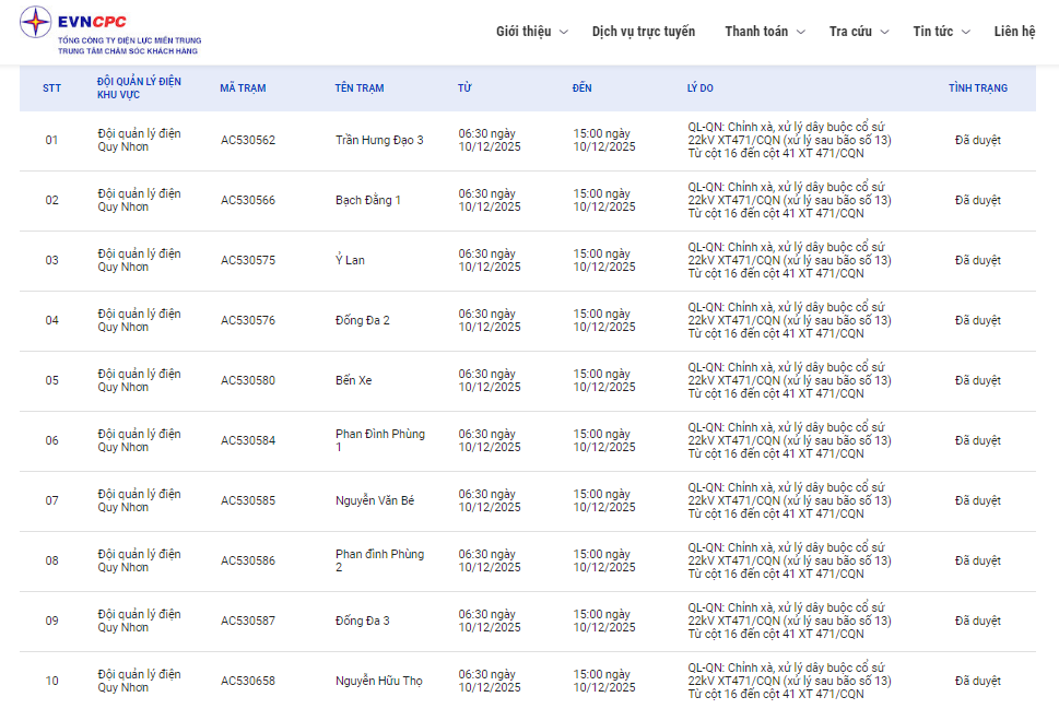 | Đội quản lý điện Quy Nhơn | AH539337 | TBA khách sạn Lake view | 06:30 10/12/2025 | 15:00 10/12/2025 | QL-QN: Chỉnh xà, xử lý dây buộc cổ sứ 22kV XT471/CQN (xử lý sau bão số 13) Từ cột 16 đến cột 41 XT 471/CQN | Đã duyệt |