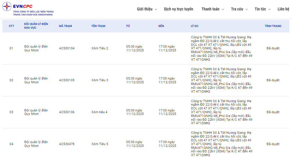 | Đội quản lý điện Quy Nhơn | AC530480 | Xóm Tiêu 7 | 05:30 11/12/2025 | 17:00 11/12/2025 | Công ty TNHH SX & TM Hương Giang: Hạ ngầm ĐD 22/0,4kV, cắt thu hồi cột, lắp DCL cột 47 XT 471/QNH2, lắp LBS cột 49 XT 471/QNH2, lắp tủ RMU471QNH2/48_Phú Gia (lắp mới) đấu nối vào ĐD 22kV (XDM) Tại K/C 47 đến 49 XT 471QNH2 | Đã duyệt |