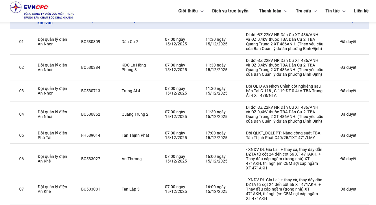 | Đội quản lý điện An Nhơn | BC530862 | Quang Trung 2 | 07:00 15/12/2025 | 11:30 15/12/2025 | Di dời ĐZ 22kV NR Dân Cư XT 486/ANH và ĐZ 0,4kV thuộc TBA Dân Cư 2, TBA Quang Trung 2 XT 486ANH. (Theo yêu cầu của Ban Quản lý dự án phường Bình Định) | Đã duyệt |