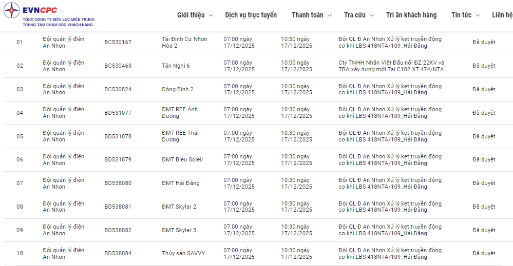 | Đội quản lý điện An Nhơn | BH531016 | Cấp điện KCN Nhơn Hòa 2 | 07:00 17/12/2025 | 10:30 17/12/2025 | Đội QL Đ An Nhơn Xử lý kẹt truyền động cơ khí LBS 418NTA/109_Hải Đăng. | Đã duyệt |