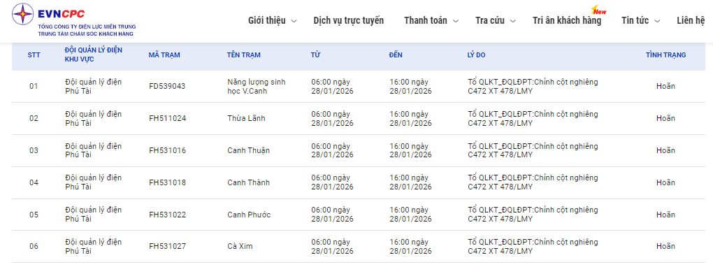 | Đội quản lý điện Phú Tài | FH531022 | Canh Phước | 06:00 28/01/2026 | 16:00 28/01/2026 | Tổ QLKT_ĐQLĐPT:Chỉnh cột nghiêng C472 XT 478/LMY | Hoãn |