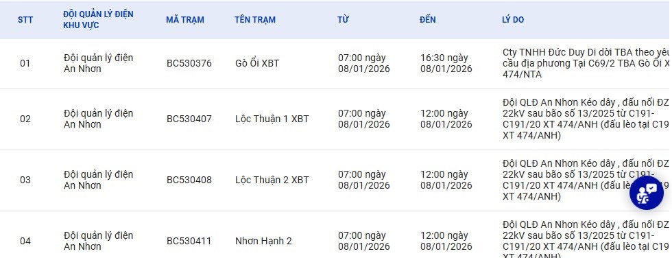 | 10 | Đội quản lý điện An Nhơn | BC530470 | KDC Chợ Quán Mới | 07:00 08/01/2026 | 12:00 08/01/2026 | Đội QLĐ An Nhơn Kéo dây , đấu nối ĐZ 22kV sau bão số 13/2025 từ C191- C191/20 XT 474/ANH(đấu lèo tại C191 XT 474/ANH) | Đã duyệt |