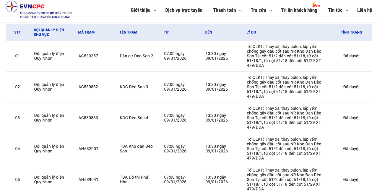 | Đội quản lý điện Quy Nhơn | AH539041 | TBA Đô thị Phú Hòa | 07:00 09/01/2026 | 13:30 09/01/2026 | Tổ QLKT: Thay xà, thay bulon, lắp yếm chống gãy đầu cốt sau NR Kho Đạn Đèo Son Tại cột 51/2 đến cột 51/18, từ cột 51/18/1, từ cột 51/18 đến cột 51/29 XT 479/ĐĐA | Đã duyệt |