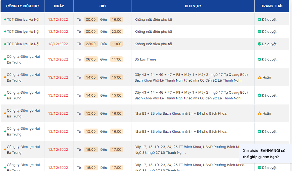 | Công ty Điện lực Hai Bà Trưng | 13/12/2022 | Từ 15:00 Đến 16:00 | Nhà E3 + E3 phụ Bách Khoa, nhà E4 + E4 phụ Bách Khoa. | Đã duyệt |