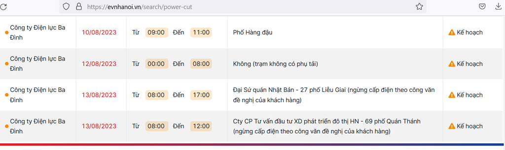 | Công ty Điện lực Ba Đình | 13/08/2023 | Từ 08:00 Đến 17:00 | Đại Sứ quán Nhật Bản - 27 phố Liễu Giai (ngừng cấp điện theo công văn đề nghị của khách hàng) | Kế hoạch |