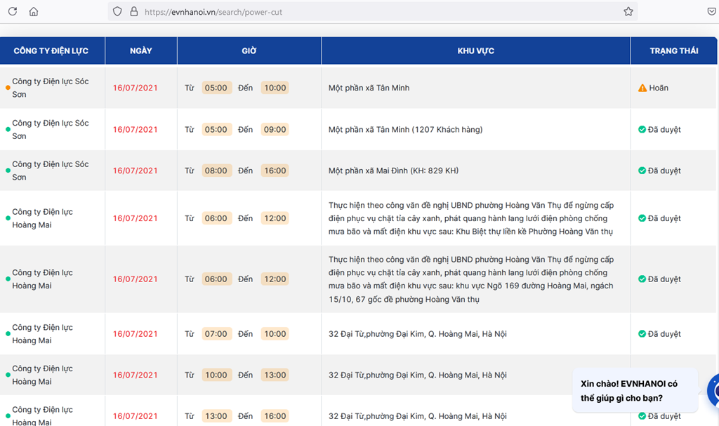 | Công ty Điện lực Hoàng Mai | 16/07/2021 | Từ 06:00 Đến 12:00 | Thực hiện theo công văn đề nghị UBND phường Hoàng Văn Thụ để ngừng cấp điện phục vụ chặt tỉa cây xanh, phát quang hành lang lưới điện phòng chống mưa bão và mất điện khu vực sau: Khu Biệt thự liền kề Phường Hoàng Văn thụ | Đã duyệt |
