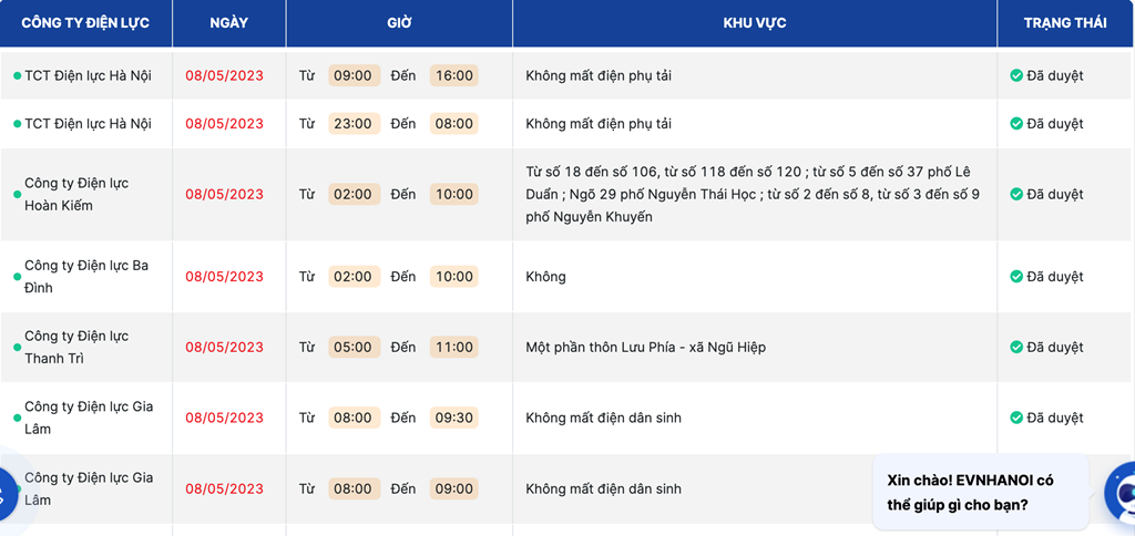 | Công ty Điện lực Hoàn Kiếm | 08/05/2023 | Từ 02:00 Đến 10:00 | Từ số 18 đến số 106, từ số 118 đến số 120 ; từ số 5 đến số 37 phố Lê Duẩn ; Ngõ 29 phố Nguyễn Thái Học ; từ số 2 đến số 8, từ số 3 đến số 9 phố Nguyễn Khuyến | Đã duyệt |