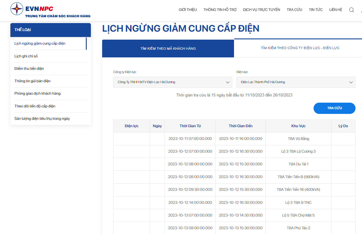 Lịch cắt điện Hải Dương ngày mai 12/10 cập nhật ngày 11/10 tại website của EVNNPC. Ảnh: BNEWS phát