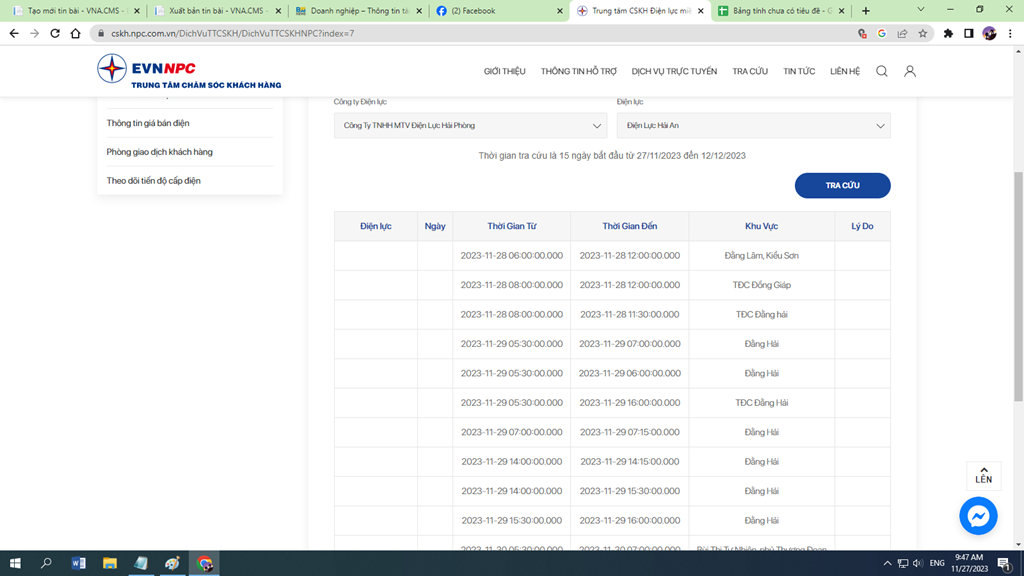 Lịch cắt điện Hải Phòng cập nhật tại website của EVNNPC. Ảnh: BNEWS