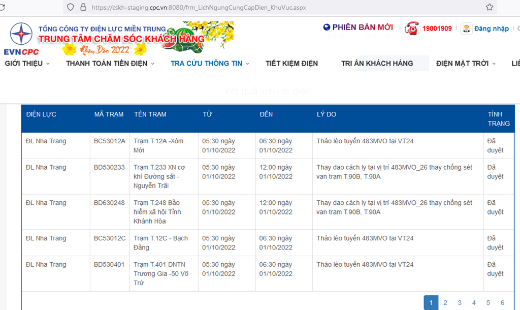 | ĐL Nha Trang | BC53081E | Trạm T.81E - Ngô Gia Tự | 05:30 ngày 01/10/2022 | 12:00 ngày 01/10/2022 | Thay dao cách ly tại vị trí 483MVO_26 thay chống sét van trạm T.90B, T.90A | Đã duyệt |