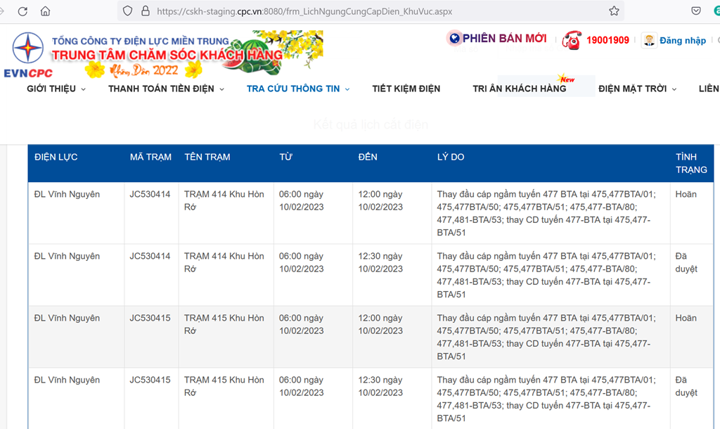 | ĐL Vĩnh Nguyên | JC53023A | Trạm 23A Thôn Phước Thủy | 06:00 ngày 10/02/2023 | 12:00 ngày 10/02/2023 | Thay đầu cáp ngầm tuyến 477 BTA tại 475,477BTA/01; 475,477BTA/50; 475,477BTA/51; 475,477-BTA/80; 477,481-BTA/53; thay CD tuyến 477-BTA tại 475,477-BTA/51 | Hoãn |