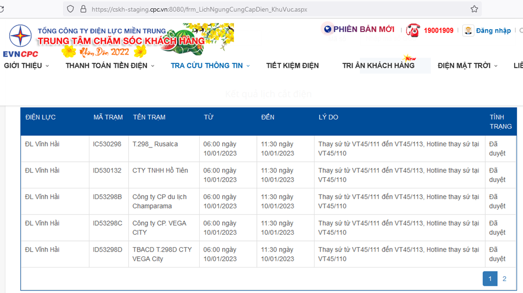 | ĐL Vĩnh Hải | ID53298E | TBACD T.298E CTy Vega City | 06:00 ngày 10/01/2023 | 11:30 ngày 10/01/2023 | Thay sứ từ VT45/111 đến VT45/113, Hotline thay sứ tại VT45/110 | Đã duyệt |